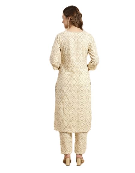 ₹900.00Original price was: ₹900.00.₹600.00Current price is: ₹600.00.A chic cream straight-cut kurta set featuring a subtle geometric print, black button accents, and matching trousers for a coordinated, professional look.