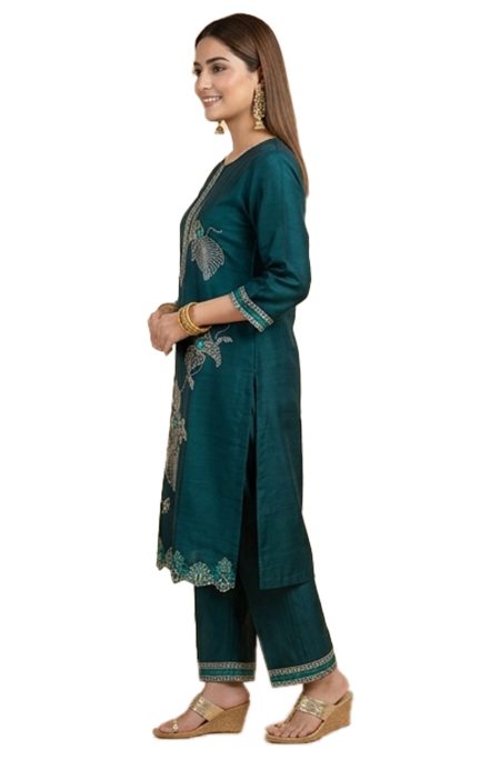 ₹1,700.00Original price was: ₹1,700.00.₹1,199.00Current price is: ₹1,199.00.Elegant teal green kurta set featuring intricate floral embroidery and a beautifully detailed hemline. Paired with matching pants and a graceful dupatta, this outfit offers a perfect blend of traditional charm and modern comfort, ideal for festive occasions and special gatherings.