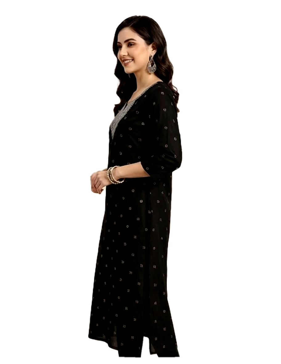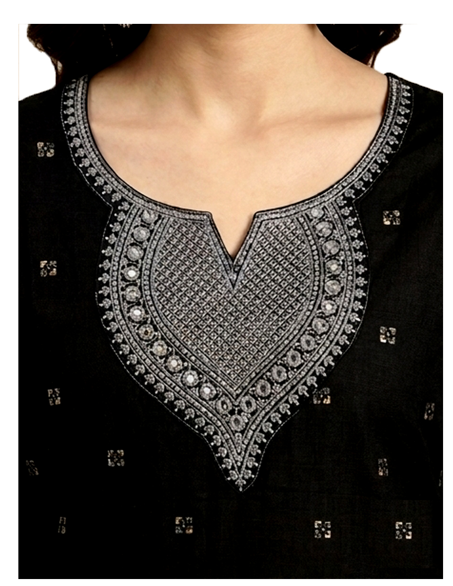 Description :Chic black kurta featuring intricate embroidered yoke and subtle motifs, tailored in a straight fit with soft fabric, perfect for festive, office, or evening occasions.