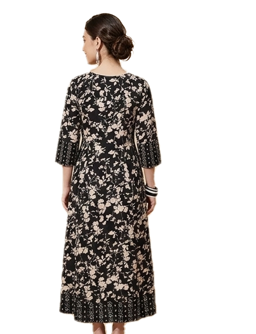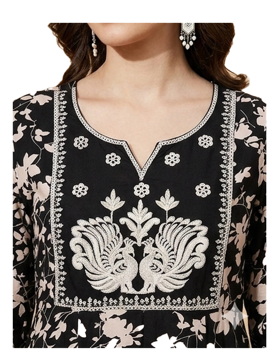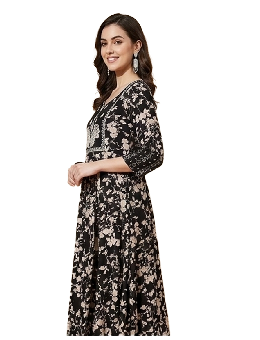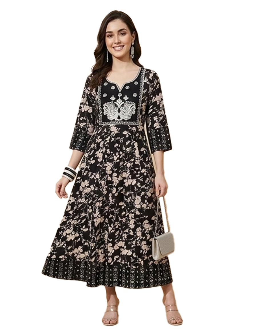 DESCRIPTION: Chic Black Anarkali dress with delicate floral prints and embroidered yoke, featuring a flared silhouette ideal for festive events and casual ethnic outings