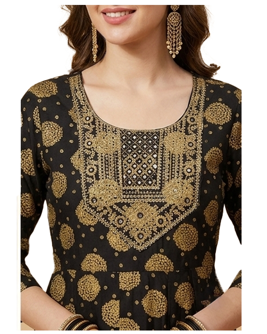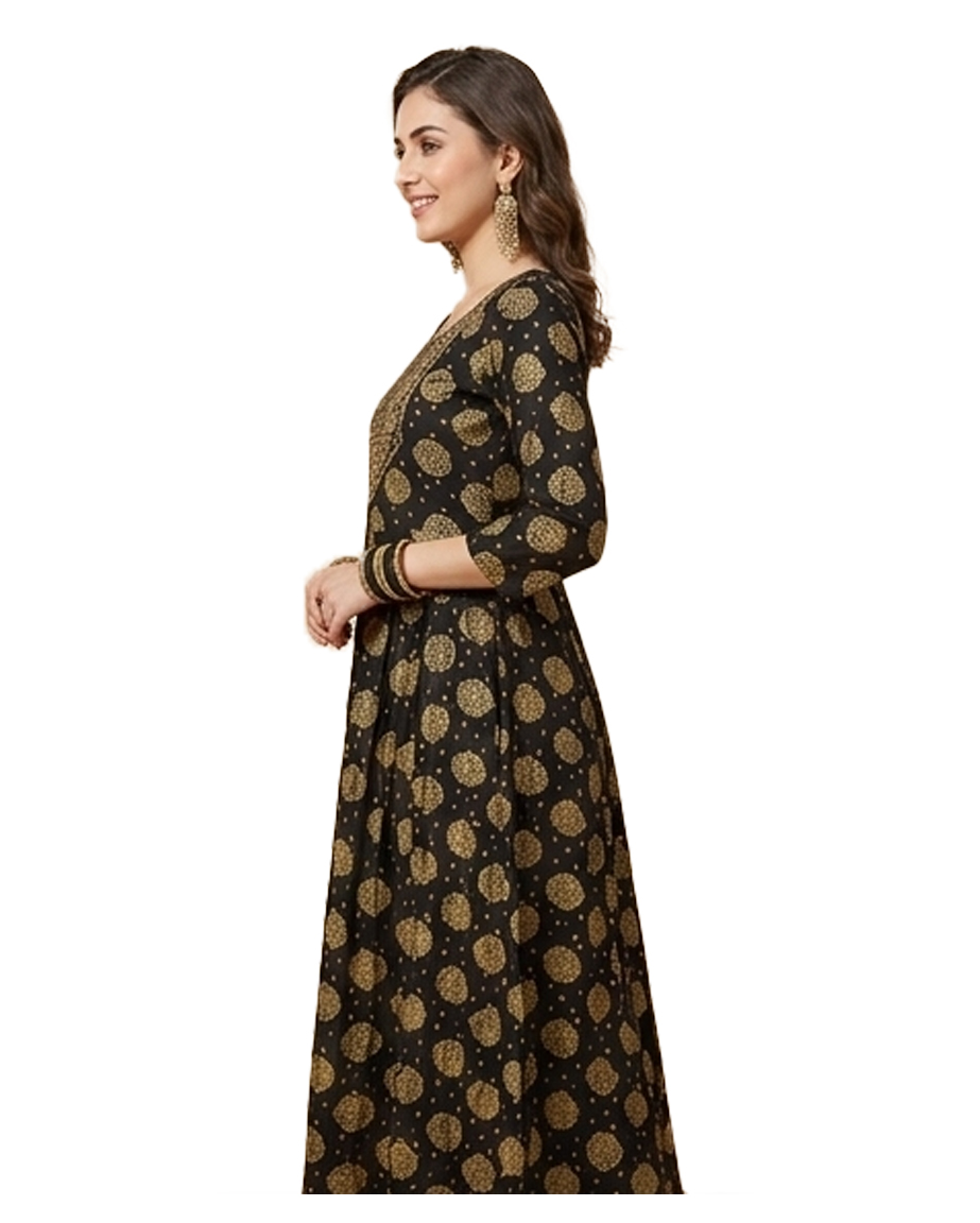 DESCRIPTION: Elegant Green Anarkali dress with rich gold prints and yoke detailing, offering a graceful flare—perfect for festive occasions and stylish ethnic gatherings