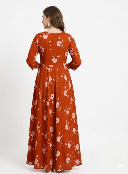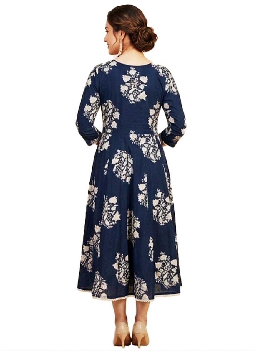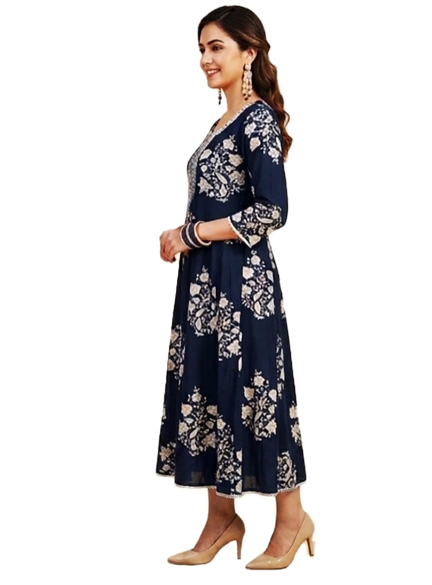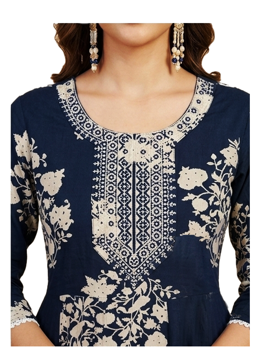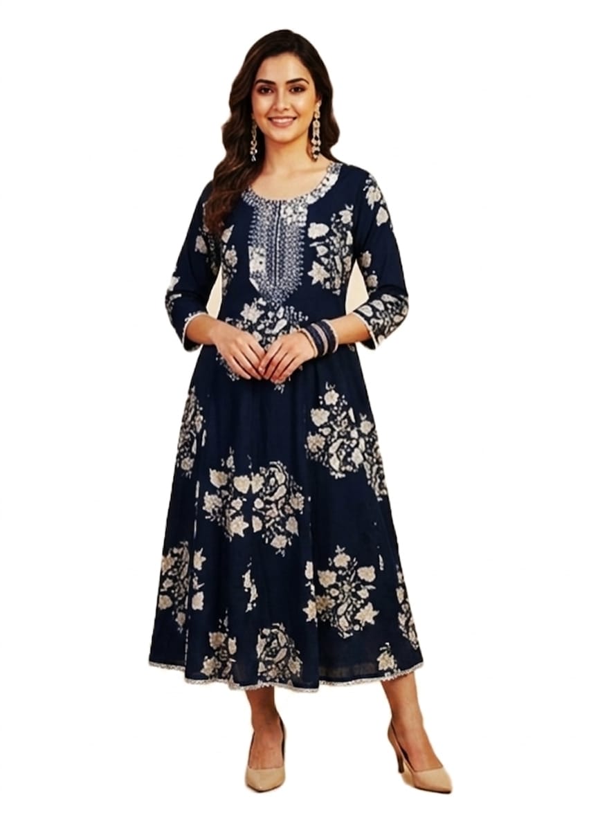 DESCRIPTION: Elegant navy Anarkali dress with floral prints and detailed yoke, featuring a graceful flared silhouette, perfect for festive celebrations and casual ethnic wear.
