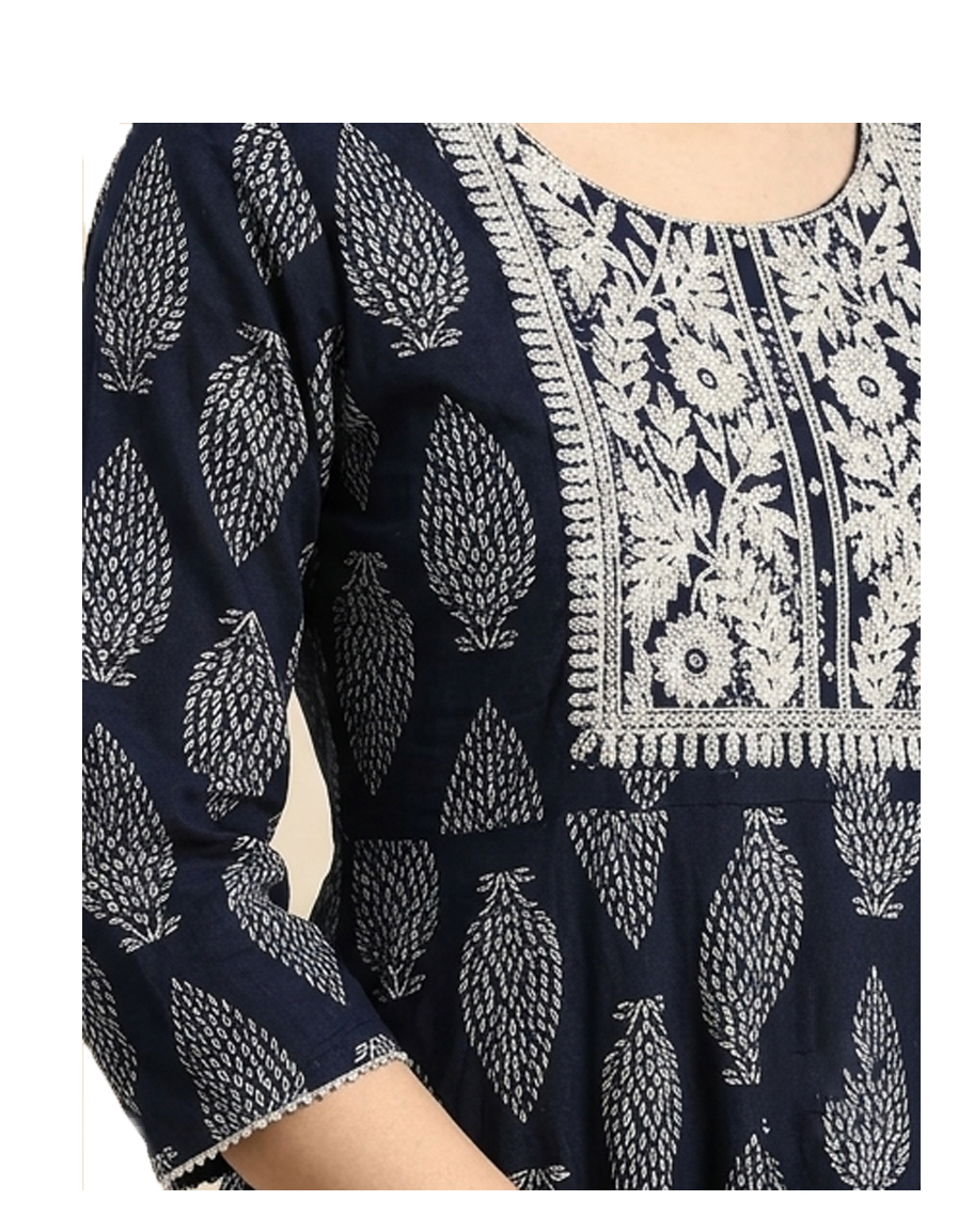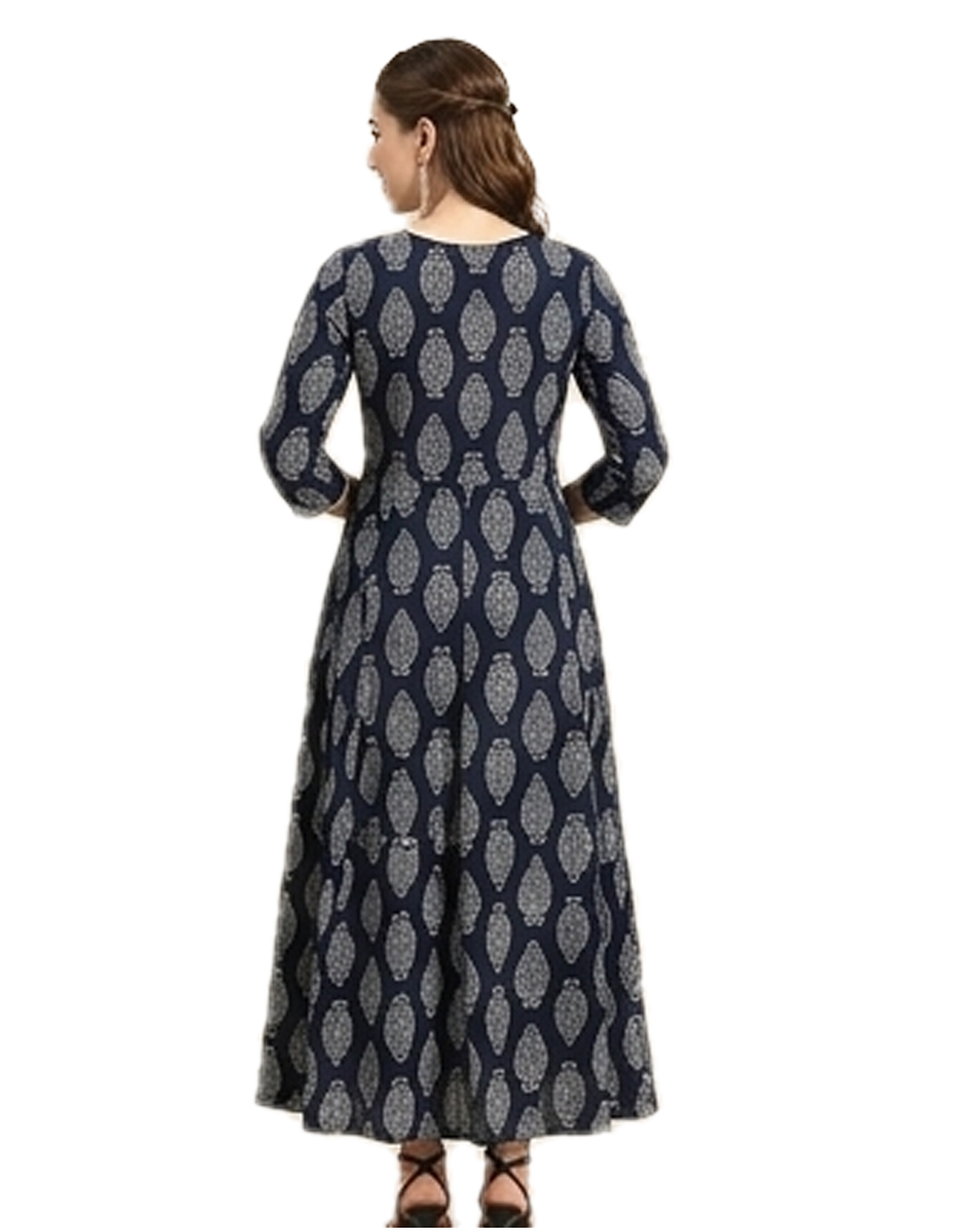 DESCRIPTION: Elegant Navy blue Anarkali dress with intricate prints, flared silhouette, and comfortable fabric, perfect for casual outings and festive occasions