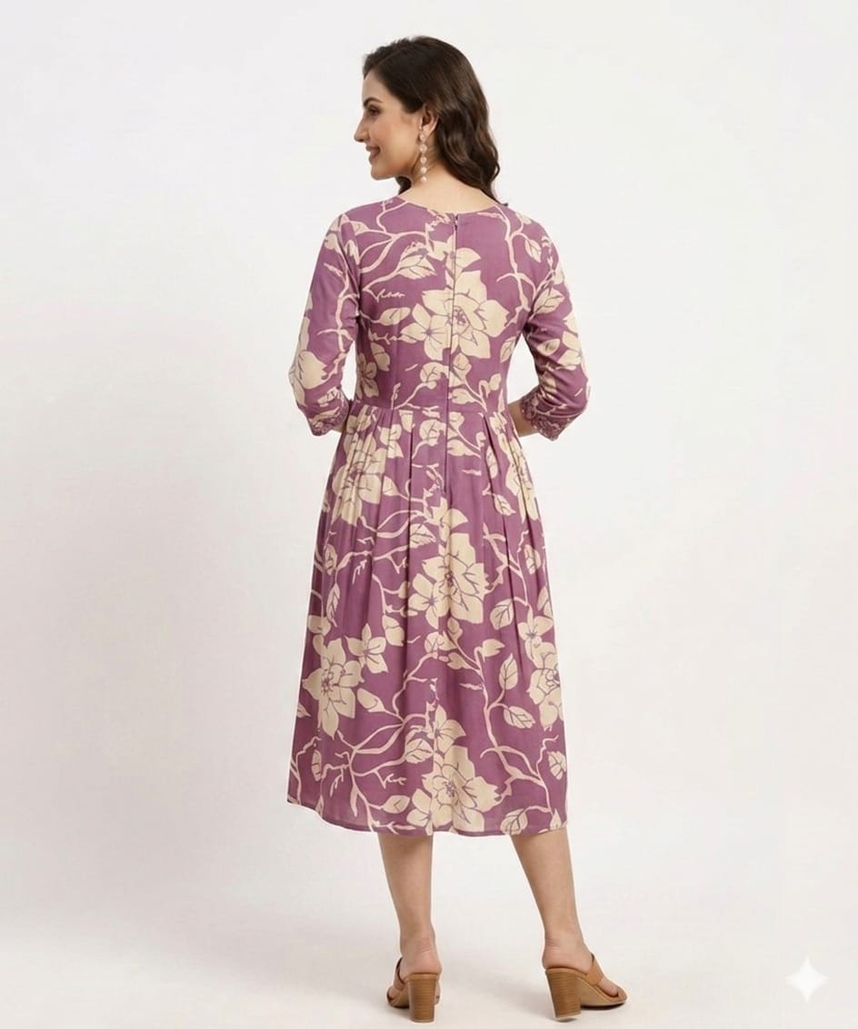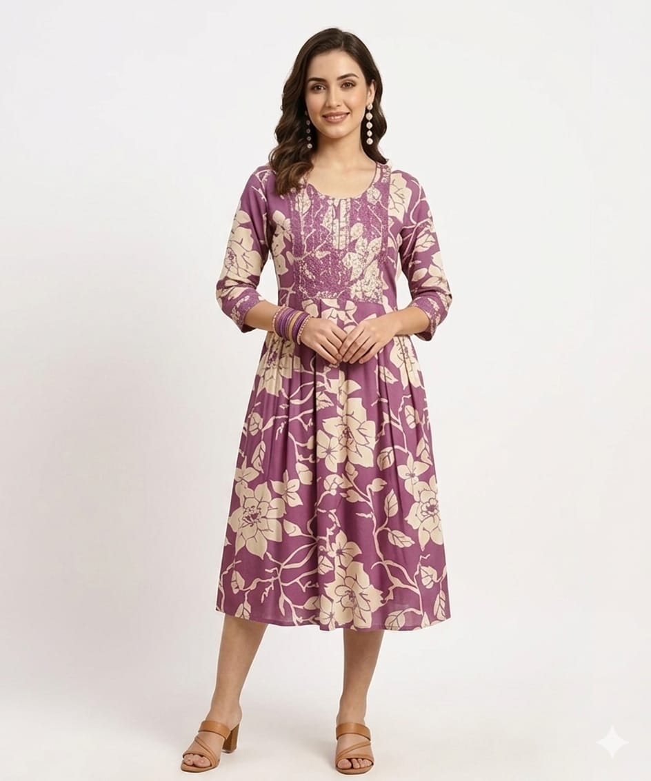 This vibrant purple dress features large white floral prints, an intricately embroidered yoke, and 3/4 sleeves, offering a breezy, elegant look for any occasion