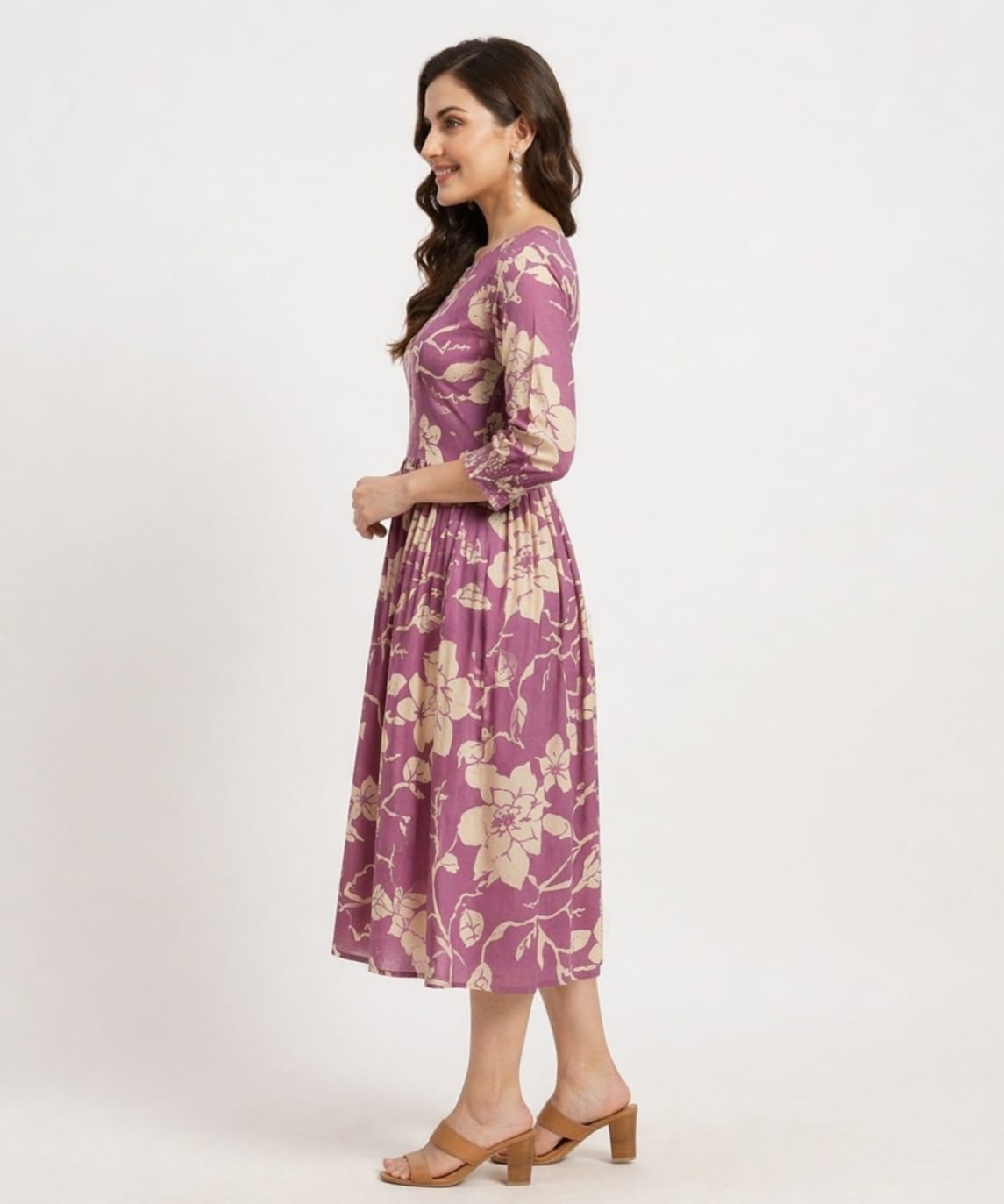 Purple Beige Floral Printed Anarkali Dress (only Top)