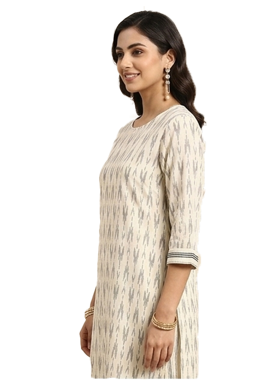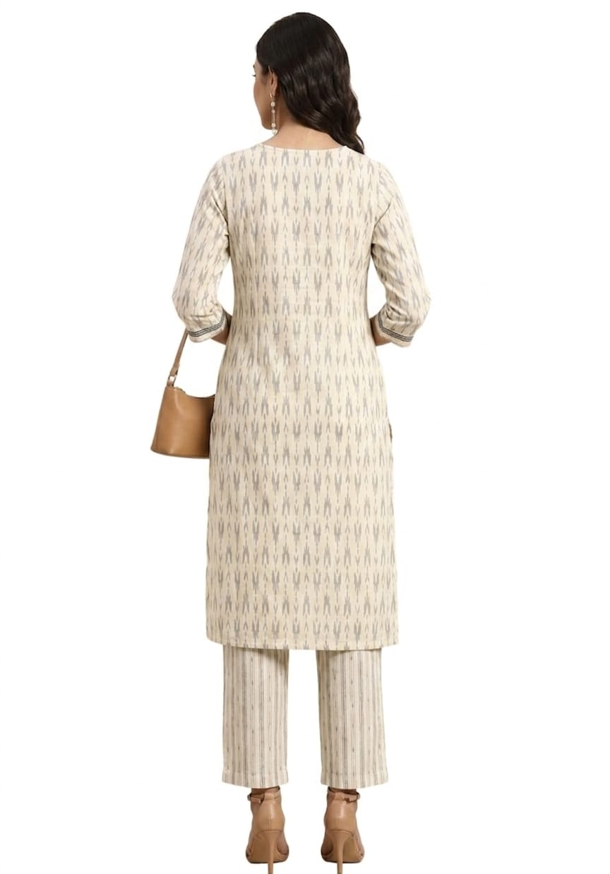 Description : A refreshing off-white cotton kurta set featuring grey ikat patterns and striped trousers, offering a sophisticated, breathable, and contemporary ethnic look.